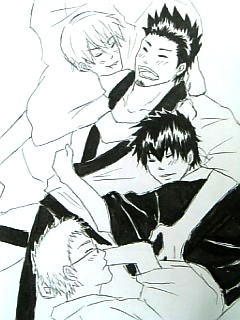 「じゃァルールの確認行くぜィ。最後の一人ンなるまで乱闘、んでその勝者の属する組が近藤さんゲット。単純な事だァ。」